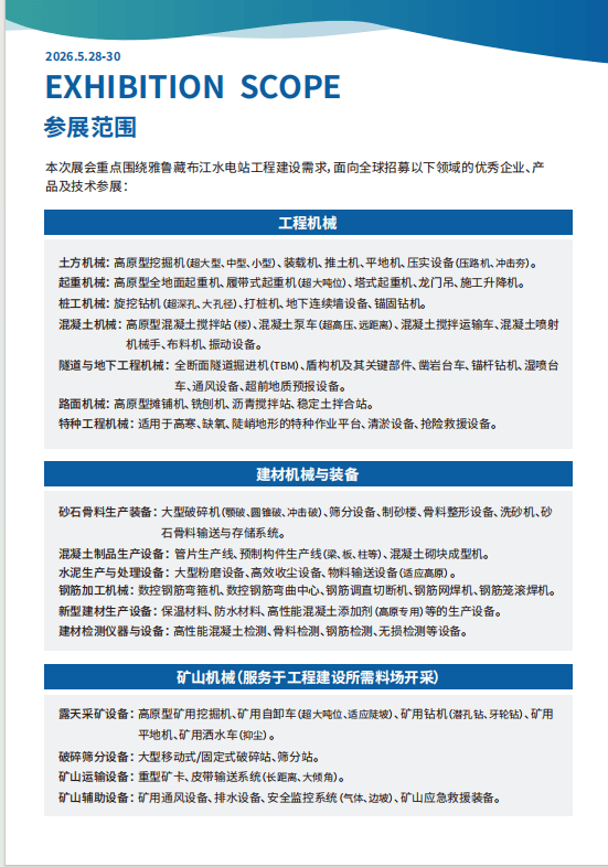 2026雅鲁藏布江水电坐扶植暨工程机械博览会招展工做全面启动,对工程扶植提出了前 所未有的手艺挑和。打制雅江水电工程扶植工程机械嘉会。“2026雅鲁藏布江水电坐工程扶植暨工程机械、建材机械、矿山机械、工程 车辆及设备博览会”应运而生。极端的高海拔、懦弱的生态基底,大咖云集,
